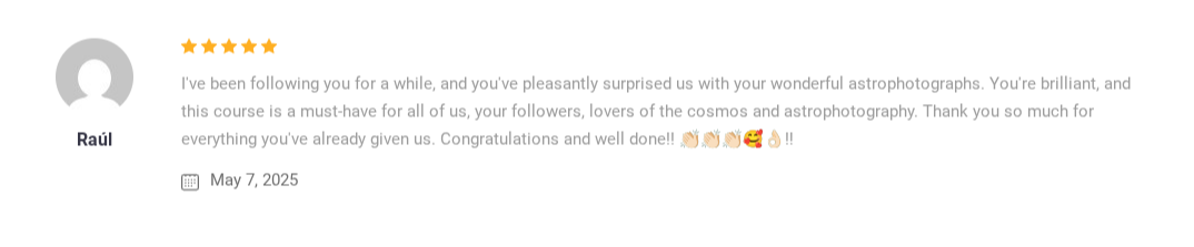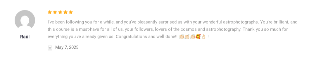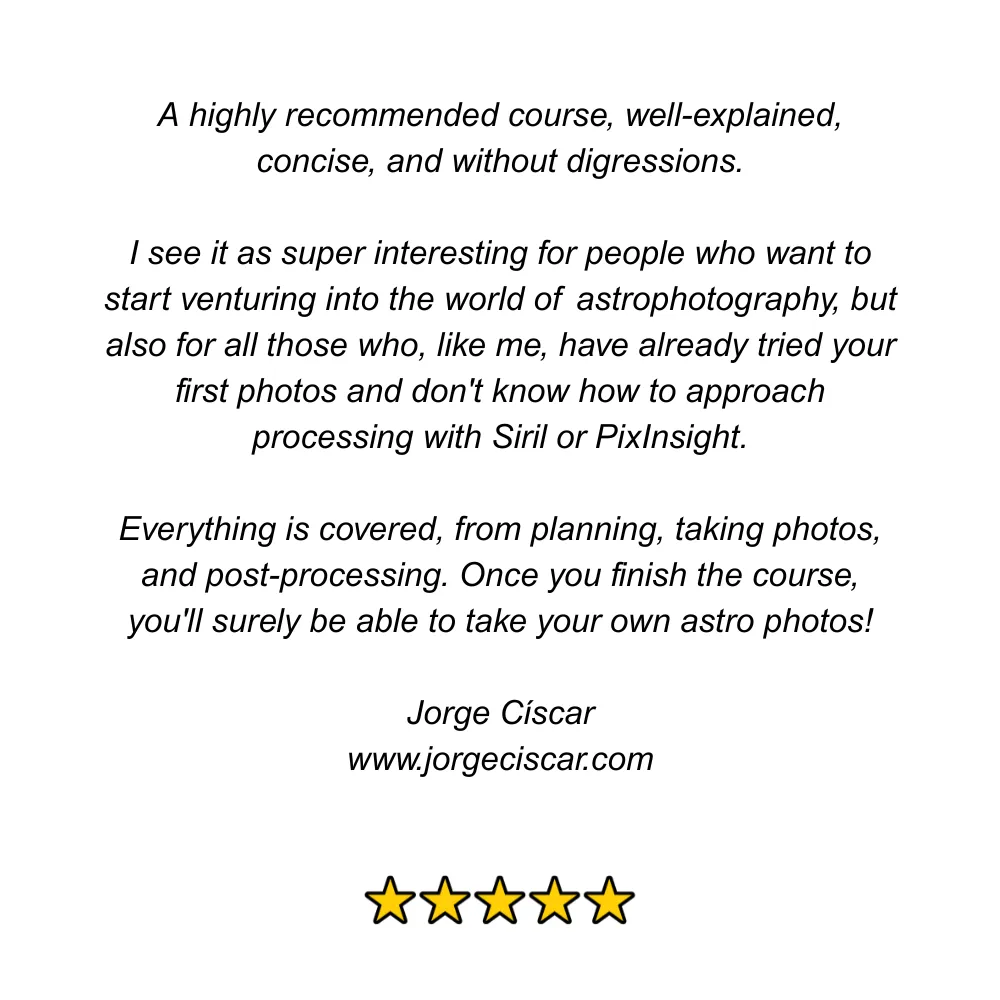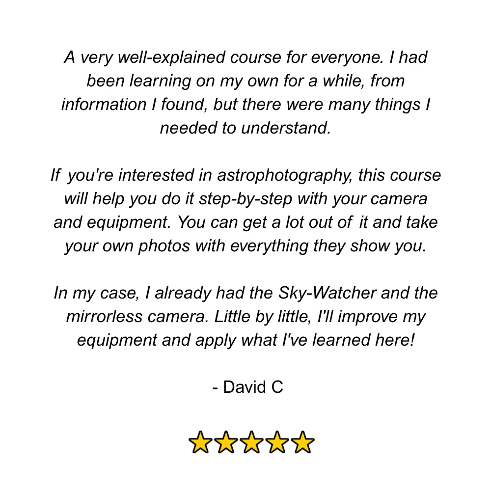 No fluff. Just practical, step-by-step instructions across five modules with no previous astrophotography experience necessary: